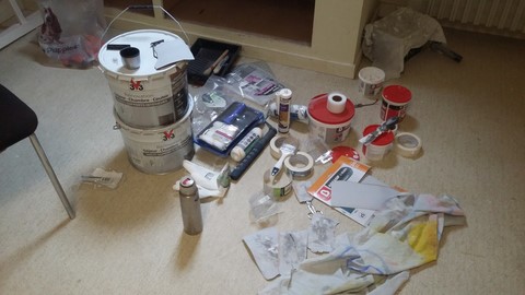 Finition de la future nouvelle septième salle du musée de l’art du collage : en osmose avec cette peinture, je me sens tout comme elle au bout du rouleau !