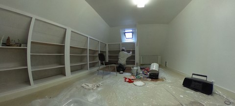 Après la rénovation de la 7ème salle, tant qu’il reste un peu de courage … de l’enduit et de la peinture, en route pour la rénovation du couloir du second étage du musée Artcolle.