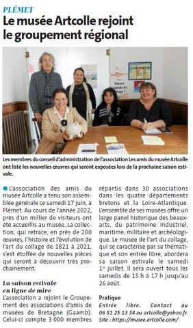 Le musée Artcolle rejoint le Groupement des associations d’amis de musées de Bretagne (Gaamb). Celui-ci compte 3 000 membres répartis dans 30 associations dans les 4 départements bretons et la Loire-Atlantique. L’ensemble de ses musées offre un large panel historique des beaux-arts, du patrimoine industriel, maritime, militaire et archéologique. Le musée de l’art du collage qui se caractérise par sa thématique et son entrée libre abordera sa saison estivale le samedi 1er juillet.Et une nouvelle saison estivale !