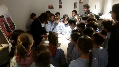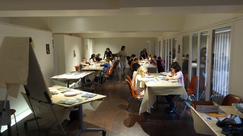 Six cents enfants initiés à l’art du collage et aux principes de composition dans le cadre de l’exposition Allégoria au musée de Sceaux.